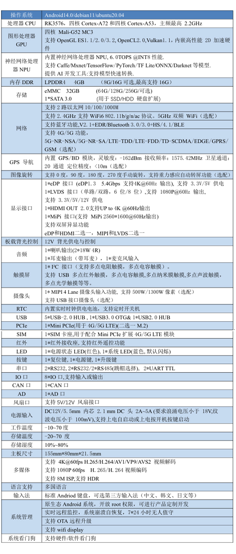 | 處理器CPU | RK3576,四核Cortex-A72和四核Cortex-A53,主頻最高2.2GHz |