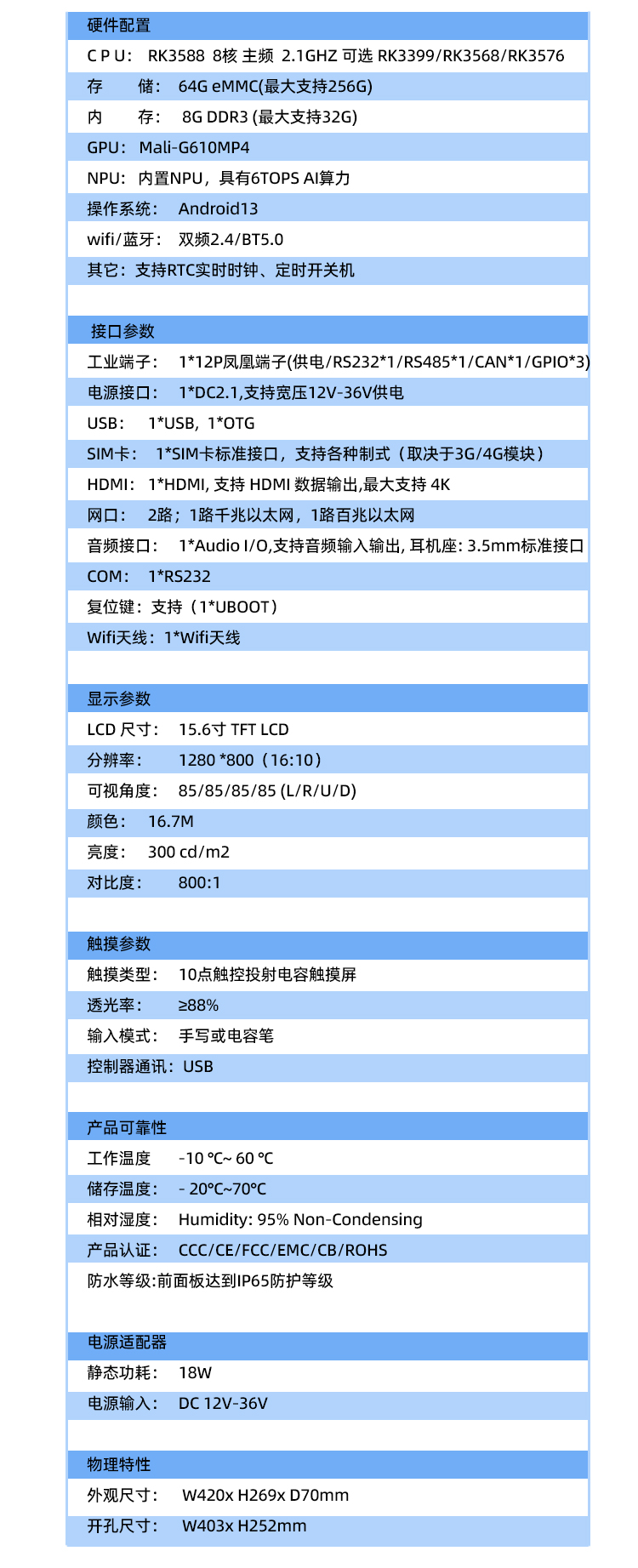 15.6寸工業一體機ARM架構RK3588防水防塵純平前面框支持二次開發